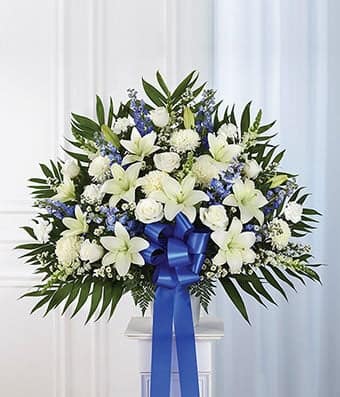 Convey sympathy with classic elegance through our Blue & White Sympathy Standing Basket. This comforting arrangement features a mix of blue and white blooms arranged in a standing basket, conveying condolences with a touch of timeless beauty. Whether it’s for a memorial service or to offer support, Blue & White Sympathy Standing Basket is a thoughtful and comforting choice that brings solace and warmth during difficult times.