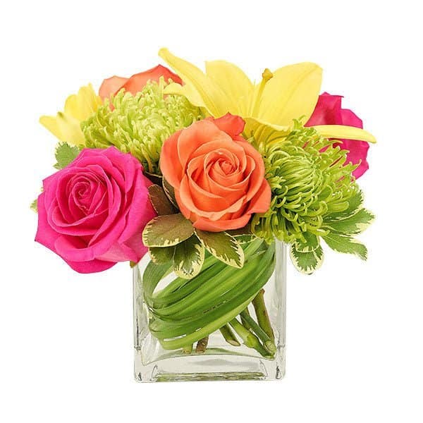 Our florists may use flowers such as 4 stems Roses – Hot Pink & Orange, 1 stem Asiatic Lily- Yellow, 2 stems Fuji Mum – Lime Green (based on seasonal availability).