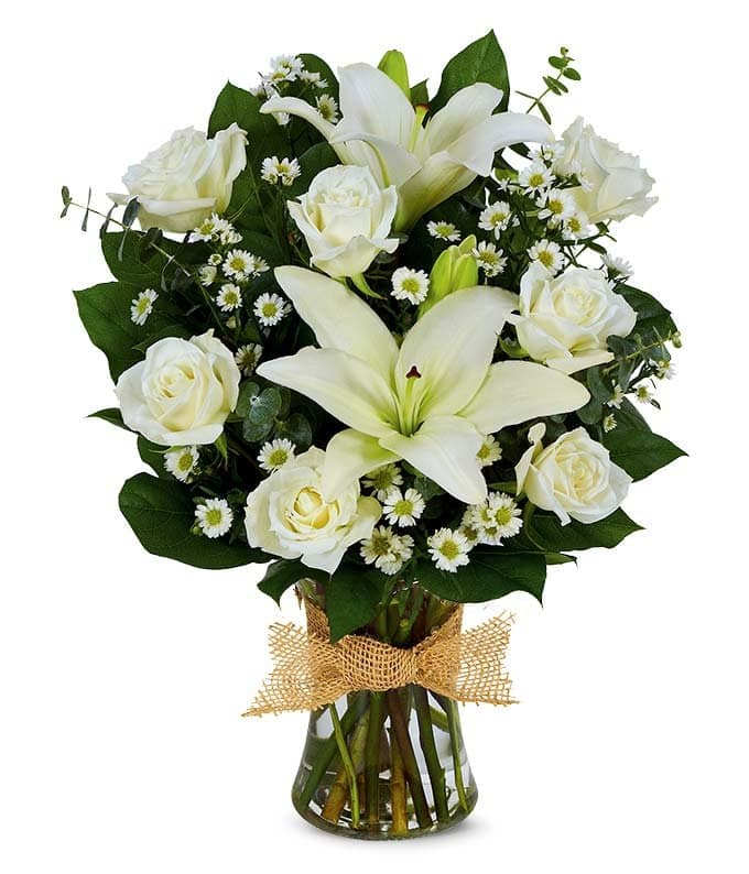 Express your condolences for the loss of a loved one with the Eternal Love bouquet. Brilliant white roses, monte casino, and Asiatic lilies are hand-arranged in a clear glass gathering vase. Topped off with a decorative ribbon, this bouquet will offer your recipient a bit of peace.