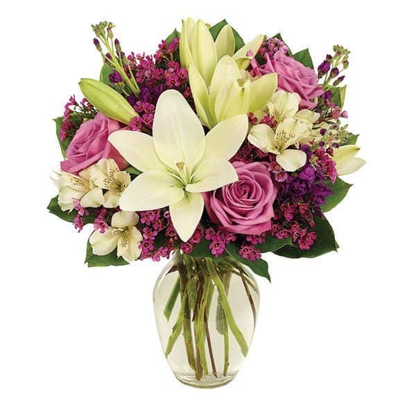 A hand-designed arrangement created by our florists at City Flower Shop featuring 3 stems Roses – Lavender, 3 stems Stock – Purple, 3 stems Alstroemeria – White. This BloomNet-certified design is arranged fresh to order and delivered with care — perfect for anniversaries.