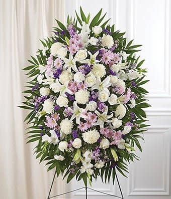 Elevate your expression of sympathy with the comforting beauty of this lavender and white-colored arrangement, a floral ensemble that speaks volumes through its gentle hues and enduring allure. Order this exquisite standing spray today and let the blossoms convey a heartfelt tribute to a life remembered with love and tranquility.