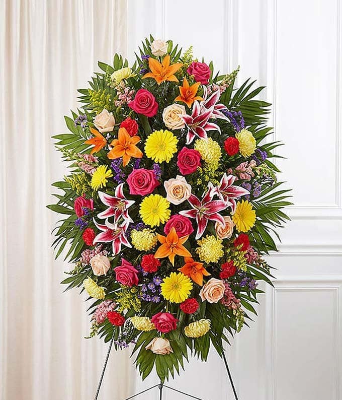 Elevate your expression of sympathy with the joyful beauty of this standing spray, a floral ensemble that speaks volumes through its vibrant hues and uplifting allure. Order this exquisite arrangement today and let the blossoms convey a heartfelt tribute to a life filled with bright memories.