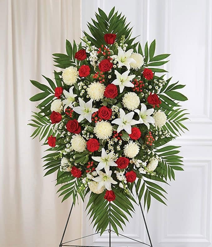 Experience the convenience of having a florist near you committed to delivering not just flowers but moments of solace and remembrance. Our commitment to quality guarantees that each bloom in this standing spray reflects the richness and respect of the “Red & White Sympathy Standing Spray.”