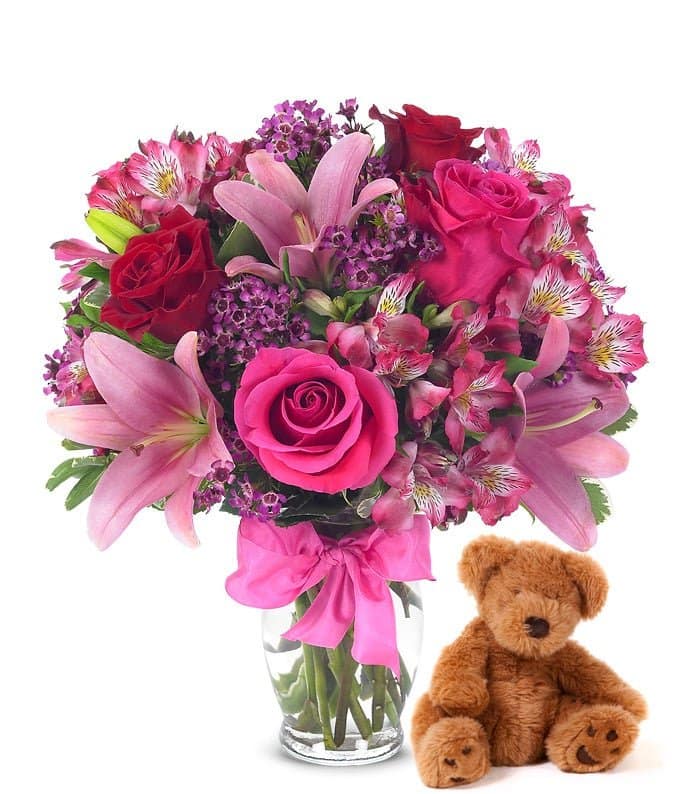 Celebrate joyously with the “Rose & Lily Celebration with Bear” bouquet. This charming arrangement features a delightful mix of roses and lilies accompanied by an adorable teddy bear. Ideal for birthdays, anniversaries, or to simply spread cheer, this bouquet combines the beauty of flowers with the comfort of a cuddly companion, making it a heartwarming and thoughtful gift.
