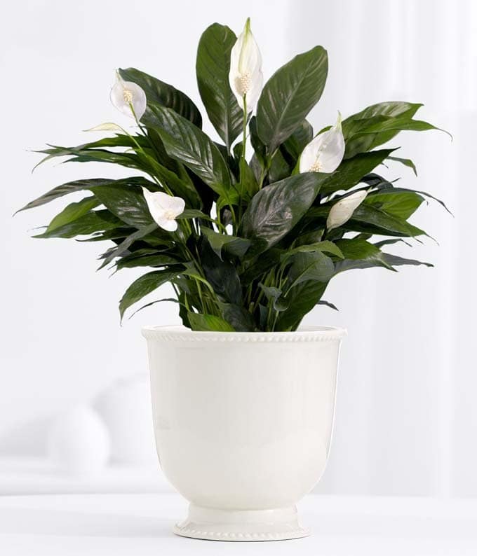 A graceful peace plant arrives in a terra cotta ceramic container. The peace plant, or Spathiphyllum, has showy white fan-like blooms above the dark green foliage. These hardy plants are perfect indoor plants and will be a lasting reminder of your thoughtfulness. Approximate height is 12″, including container; 5″ diameter potted plant. To ensure the best quality, the flower color may vary.