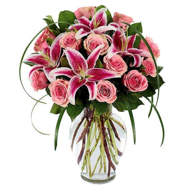 Our florists may use flowers such as 12 stems Roses – Pink, 2 stems Stargazer Lily – Pink (based on seasonal availability).
