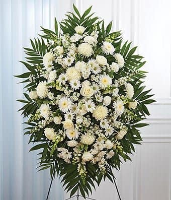 Elevate your expression of sympathy with the comforting beauty of this white-colored arrangement, a floral ensemble that speaks volumes through its gentle hues and enduring allure. Order this exquisite standing spray today and let the blossoms convey a heartfelt tribute to a life remembered with love and tranquility.